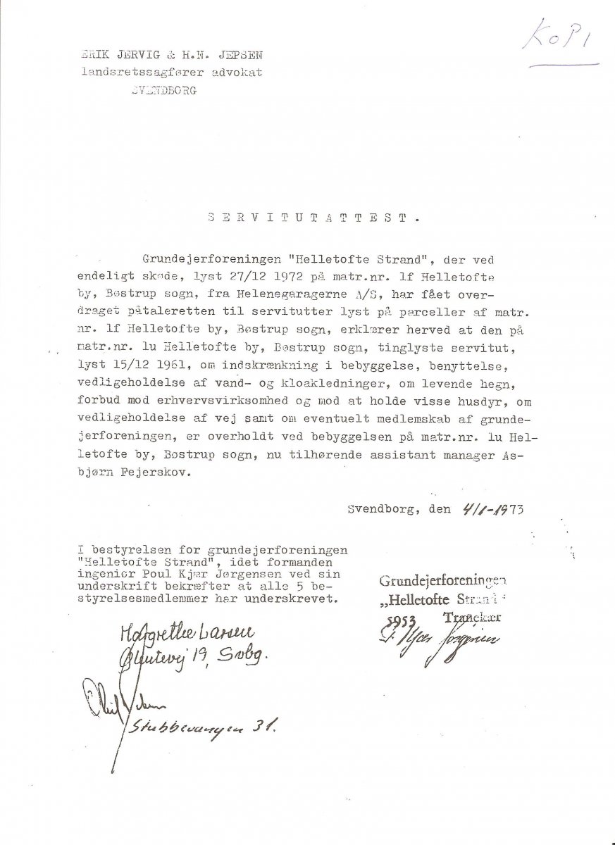 Helletofte Strand er reguleret af en servitut fra 1962 og er tinglyst på samtlige ejendomme på området. Servitutten forpligter de til enhver tid værende ejere af ejendommene på Helletofte Strand til at respektere indholdet.